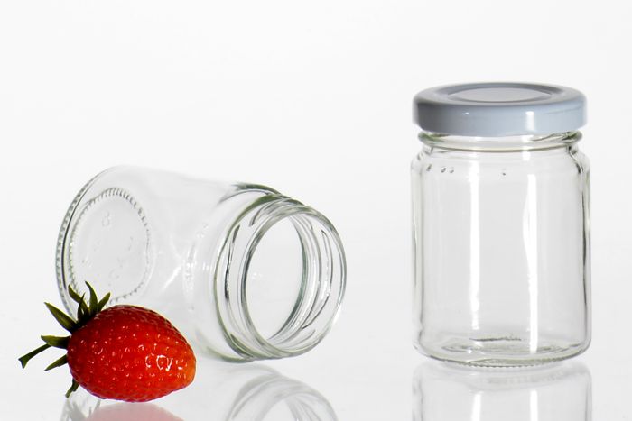 Schraubglas rund mit flachem Boden48er Twist-Off Deckel in Weiß, oder Schwarz.